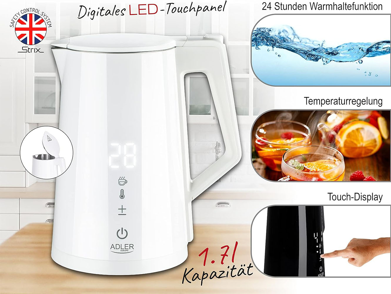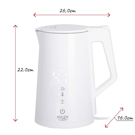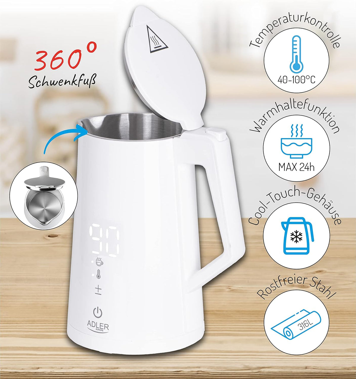 O Ηλεκτρικός Βραστήρας ADLER  από Ανοξείδωτο Χάλυβα είναι μια σύγχρονη, υψηλής απόδοσης συσκευή, σχεδιασμένη για να προσφέρει ευκολία και ασφάλεια. Με κομψό λευκό φινίρισμα και γυαλιστερή επιφάνεια, αποτελεί μια κομψή και πρακτική προσθήκη σε κάθε κουζίνα. Η βραστήρα αυτή διαθέτει προηγμένες δυνατότητες, όπως έλεγχο θερμοκρασίας από 40°C έως 100°C, λειτουργία διατήρησης θερμοκρασίας για 24 ώρες, καθώς και αρκετά χαρακτηριστικά ασφαλείας, κάνοντάς την την τέλεια επιλογή για ακριβές και ασφαλές βράσιμο νερού.