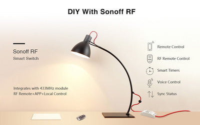 Το Sonoff RF είναι μια οικονομική συσκευή χαμηλού κόστους, που σας βοηθά να μετατρέψετε το σπίτι σας σε "έξυπνο σπίτι". Είναι ένας WiFi ασύρματος διακόπτης που μπορεί να συνδεθεί σε οικιακές συσκευές διαφορετικών τύπων και κατασκευαστών. Το Sonoff στέλνει στοιχεία σε cloud πλατφόρμα μέσα από το WiFi Router και σας επιτρέπει να ελέγχετε από μακριά όλες τις οικιακές συσκευές σας με την εφαρμογή eWeLink από το smartphone σας. Το Sonoff κάνει όλες τις οικιακές συσκευές σας έξυπνες, και όσο το τηλέφωνό σας είναι συνδεδεμένο στο δίκτυο μπορείτε να ελέγξετε από οπουδήποτε τις οικιακές συσκευές σας. θέτοντας χρονικά όρια για τις οικιακές συσκευές σας, μπορείτε να έχετε περισσότερο ελεύθερο χρόνο. Συνεργάζεται με το RF remote controller (δεν συμπεριλαμβάνεται στη συσκευασία), που σας επιτρέπει να έχετε έλεγχο στις οικιακές συσκευές σας.