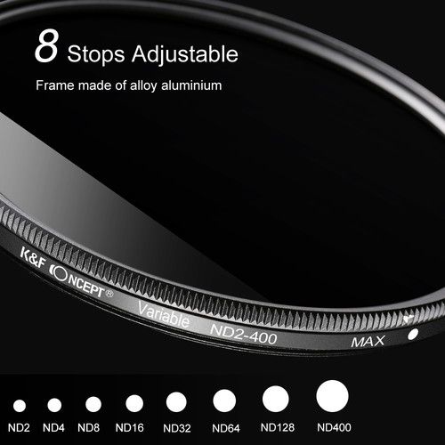 This Variable Fader ND2-ND400 Filter from K&F Concept is a 82mm variable neutral density filter providing an adjustable light reduction of 1 to 8.6 stops. It darkens the entire image evenly, allowing a photograph to be made with a wider aperture or slower shutter speed than normally required. By slowing the exposure time or increasing the aperture, it is possible to control the depth of field and blur movement easily, creating a dynamic look for streams, waterfalls, landscapes, and more.