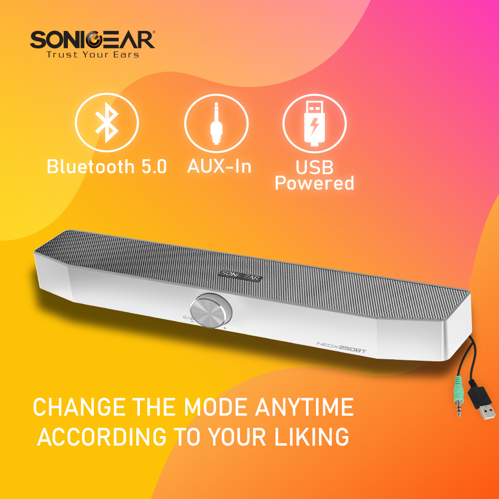 Απολαύστε εκπληκτική ηχητική απόδοση και ζωντανά RGB εφέ με το SONIC GEAR Neox 250BT Soundbar. Με έως 20W μέγιστη ισχύ εξόδου και 5 RGB εφέ κεραυνού, αυτό το ηχείο προσφέρει εντυπωσιακή ποιότητα ήχου και οπτικά εφέ, για μία καθηλωτική εμπειρία ήχου και εικόνας.