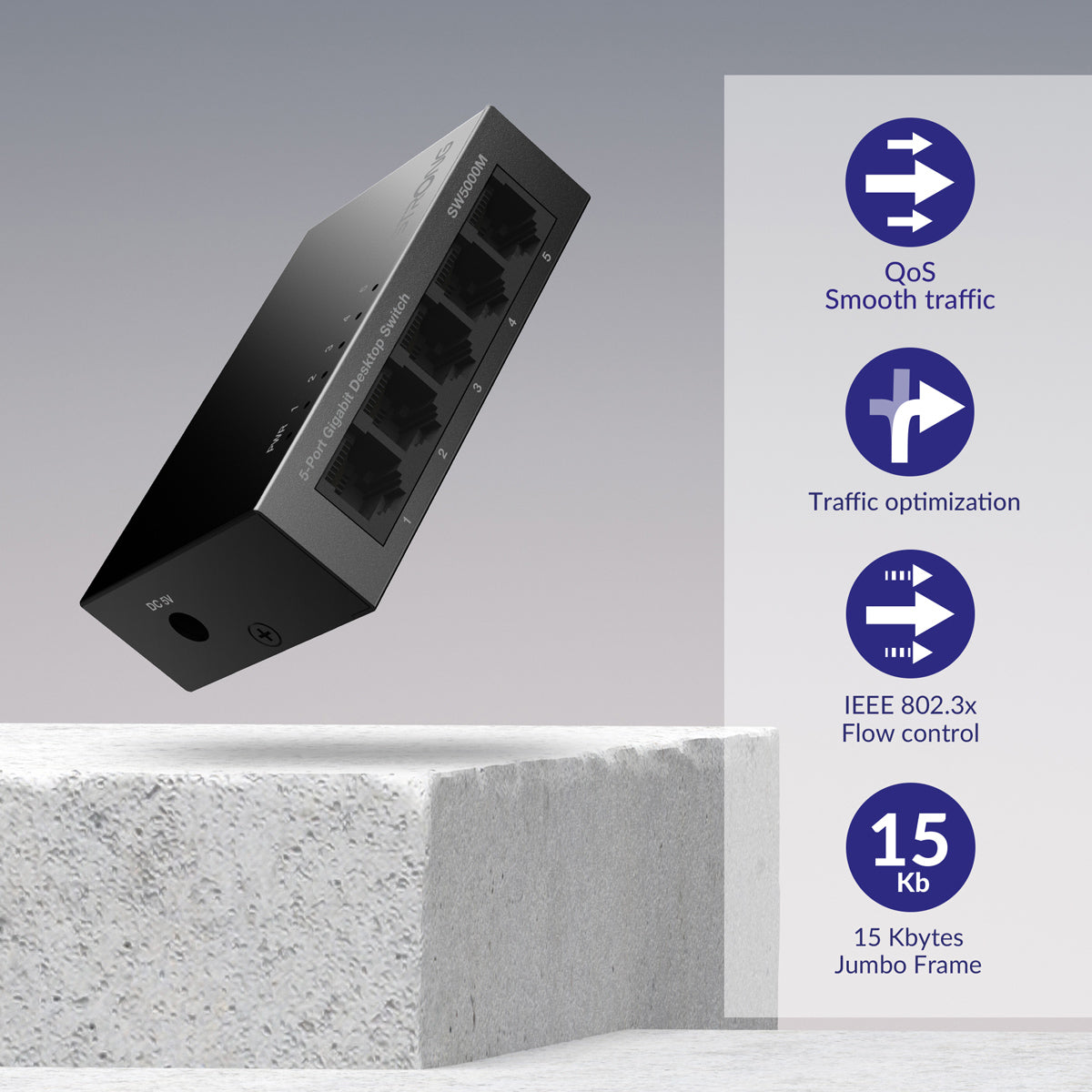 Το switch της STRONG σας επιτρέπει να επεκτείνετε το ενσύρματο δίκτυο σας με 5x θύρες δικτύου που προσφέρουν ταχύτητες έως 1000Mbps.