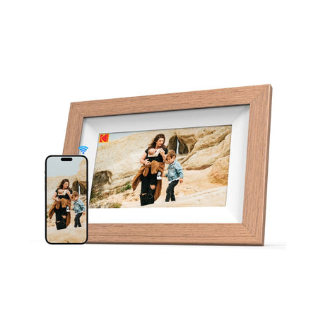 Mit Touchscreen-Bedienung, verstellbarem Standfuß und einer eleganten Kombination aus Holz und Kunststoff fügt sich der KODAK RCF-702W nahtlos in Ihre Raumdekoration ein und bietet ein modernes Lifestyle-Erlebnis zur Anzeige von Erinnerungen.