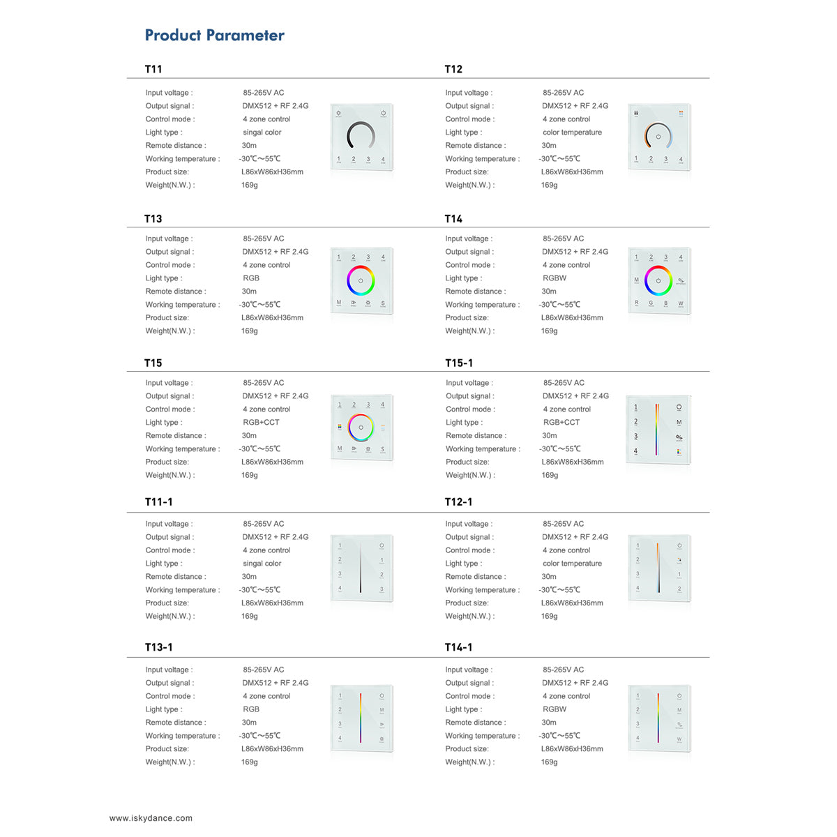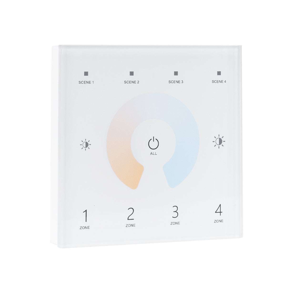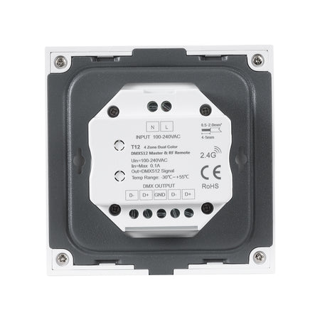 73160 T12 SKYDANCE Wireless DMX512 Wandcontroller RF 2,4 GHz 4 Gruppen für alle SKYDANCE DMX512 Controller AC 100–240 V Max. 0,1 A – IP20 M8,5 x B8,5 x H3,5 cm – 5 Jahre Garantie