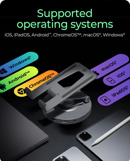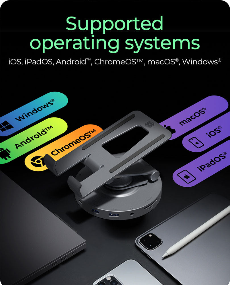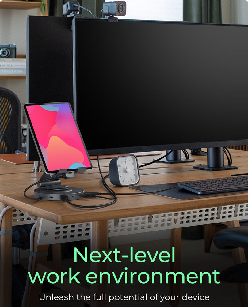 Η IB-TH100-DK είναι μια ευέλικτη βάση για tablet και smartphone που μετατρέπει τη συσκευή σας σε πλήρες επιτραπέζιο σταθμό εργασίας. Συνδυάζει εργονομική λειτουργικότητα με ισχυρές δυνατότητες συνδεσιμότητας, βελτιώνοντας την παραγωγικότητα και τη διασκέδαση σας.