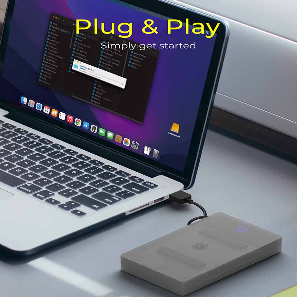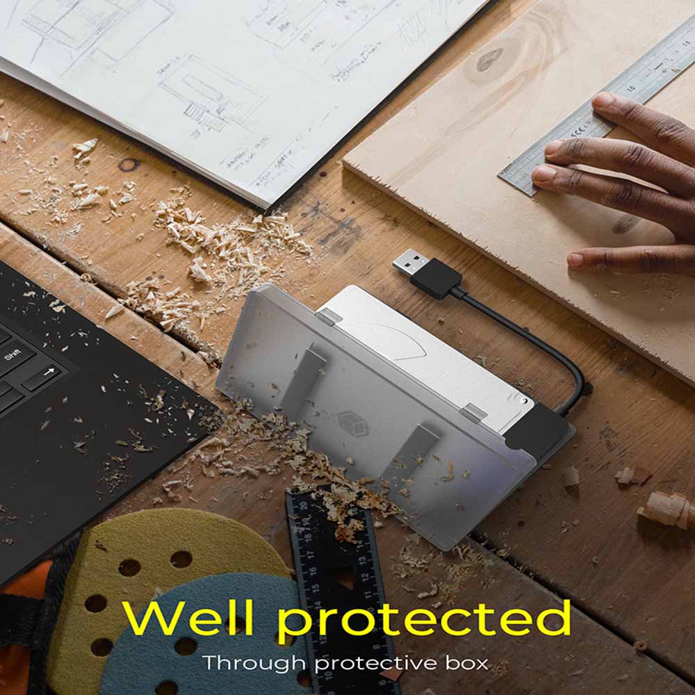 • Προστατευμένο Σχέδιο: Περιλαμβάνει προστατευτική πλαστική θήκη με μηχανισμό κλικ-κλειδώματος, που προστατεύει τον SSD από σκόνη και κραδασμούς.