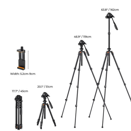 Leicht und tragbar: Das 4-teilige Bein kann die Stativhöhe von 20,1''/51 cm bis 63,8''/162 cm verstellen. Es kann auf 15,3''/39 cm zusammengeklappt werden, um es einfach in der Tragetasche zu verstauen. Das Nettogewicht beträgt inklusive Kugelkopf nur 1,16 kg.