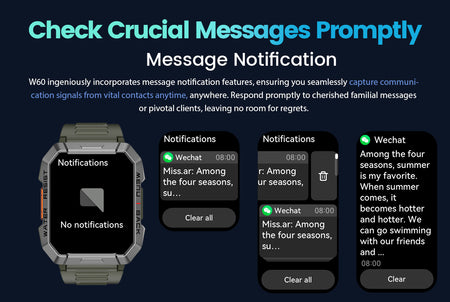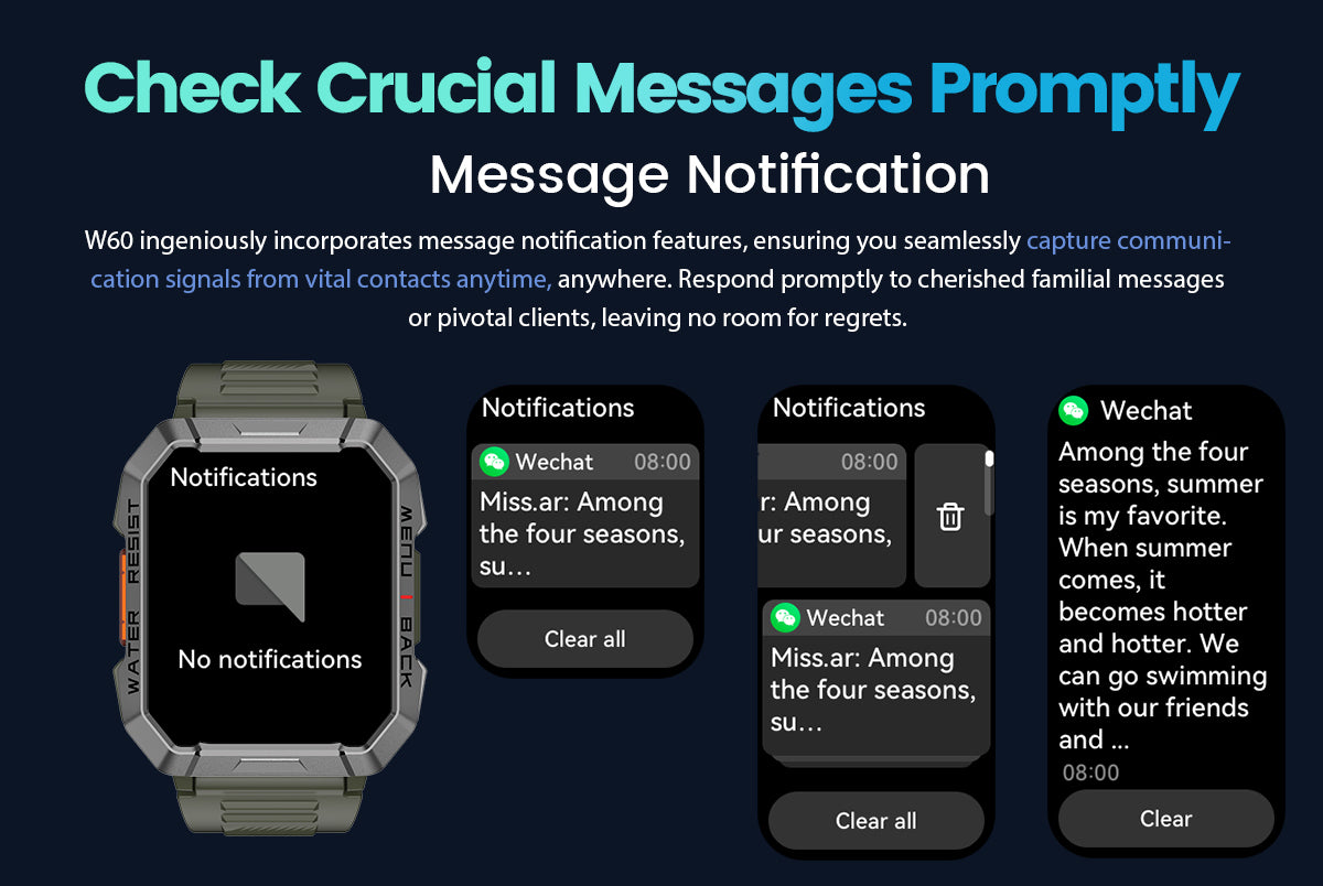 Η φιλική προς το χρήστη διεπαφή υποστηρίζει πολλές γλώσσες, καθιστώντας την πλοήγηση εύκολη για τους φυσικούς ομιλητές ή για όσους γνωρίζουν άπταιστα πολλές γλώσσες. Το Smartwatch W60 είναι ένα απαραίτητο αξεσουάρ για τη σύγχρονη ζωή, εξασφαλίζοντας μια απρόσκοπτη και διαισθητική εμπειρία χρήσης.