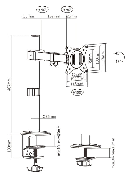 Πάχος επιφάνειας εργασίας: Clamp: 10~85mm, Grommet: 10~40mm