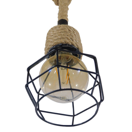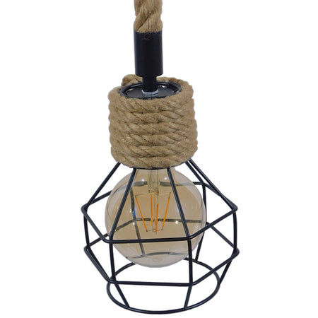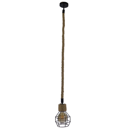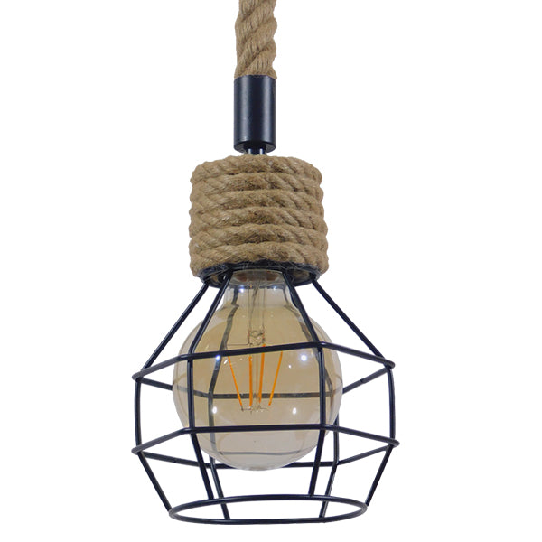 GloboStar® HELLET 01182 Vintage Industrial Κρεμαστό Φωτιστικό Οροφής Μονόφωτο Μαύρο Μεταλλικό Πλέγμα με Μπεζ Σχοινί Φ16 x Y25cm
