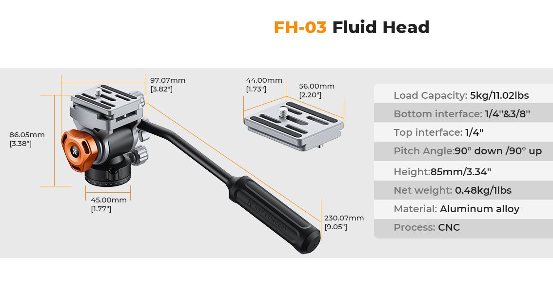 Η μικρή υδραυλική κεφαλή FH-03 είναι μια συμπαγής κεφαλή που ζυγίζει μόνο 484γρ. Υιοθετεί έναν ελαφρύ σχεδιασμό, είναι ελαφρύ σε βάρος, μικρό σε μέγεθος, εύκολο στη μεταφορά και χρήση και είναι κατάλληλο για υπαίθριες λήψεις και ταξιδιωτικές φωτογραφίες.