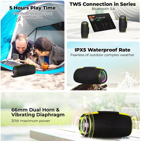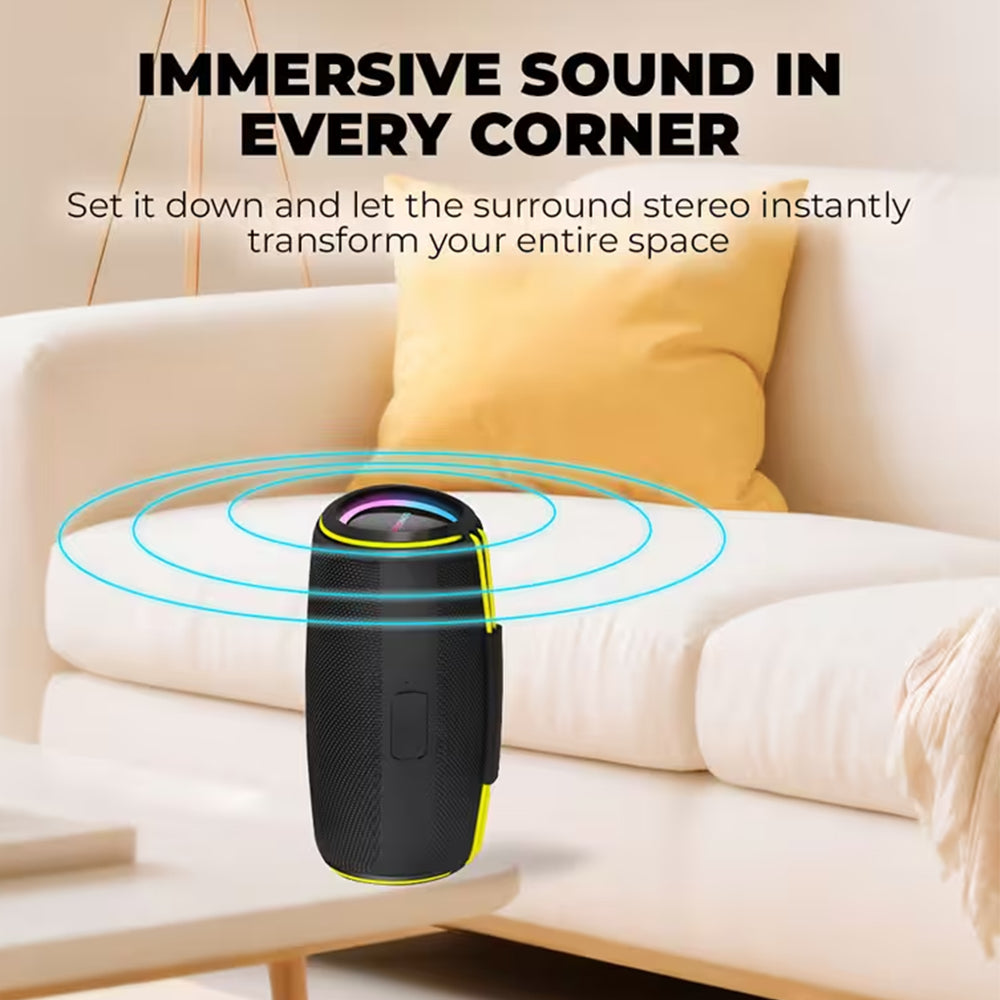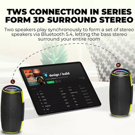 Η υποστήριξη Bluetooth 5.4 εξασφαλίζει σταθερή σύνδεση, ενώ η δυνατότητα TWS Pairing επιτρέπει τη σύνδεση δύο ηχείων για πραγματικό στερεοφωνικό αποτέλεσμα. Η πιστοποίηση IPX5 προστατεύει από νερό και πιτσιλιές, καθιστώντας το κατάλληλο για παραλία, πισίνα ή camping.