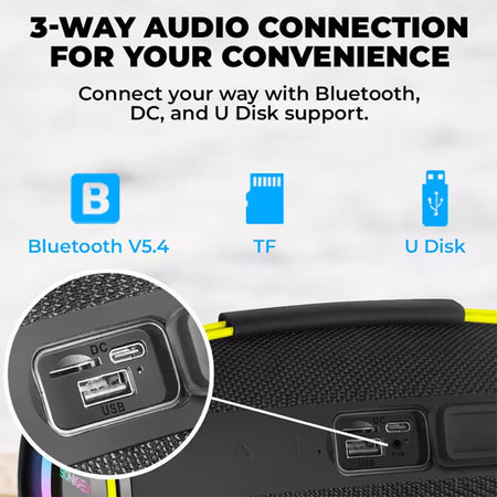 Το RGB Light σύστημα προσθέτει εντυπωσιακή οπτική εμπειρία, ενώ οι πολλαπλές επιλογές αναπαραγωγής (USB, TF/SD card, AUX-IN) προσφέρουν απόλυτη ευελιξία. Η διπλή μπαταρία 2×2000mAh (7.4V) προσφέρει έως 5 ώρες αυτονομίας, με γρήγορη φόρτιση μέσω Type-C.