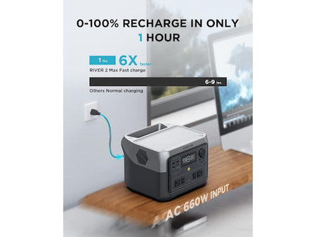 Το RIVER 2 Max ξεπερνά το βιομηχανικό πρότυπο ταχύτητας φόρτισης, φορτίζοντας πλήρως σε μόλις 60 λεπτά. Αυτό είναι 5x ταχύτερο από άλλους φορητούς σταθμούς τροφοδοσίας στην αγορά και 38% ταχύτερο από τις προηγούμενες γενιές. Φορτίστε πλήρως το RIVER 2 Max ενώ ετοιμάζετε τις βαλίτσες σας, ώστε να είστε πάντα έτοιμοι για ένα ταξίδι της τελευταίας στιγμής.