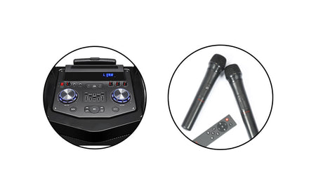 - Σύστημα καραόκε με 2 συμπεριλαμβανόμενα ασύρματα μικρόφωνα.