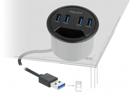 Αυτό το USB hub της Delock μπορεί να τοποθετηθεί σε μια υπάρχουσα εγκοπή στο γραφείο σας και να συνδεθεί με τον υπολογιστή σας μέσω θύρας USB για να επεκτείνει τις θύρες του με 4x USB 3.2 θύρες.