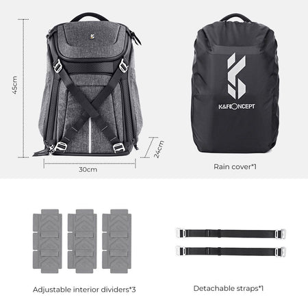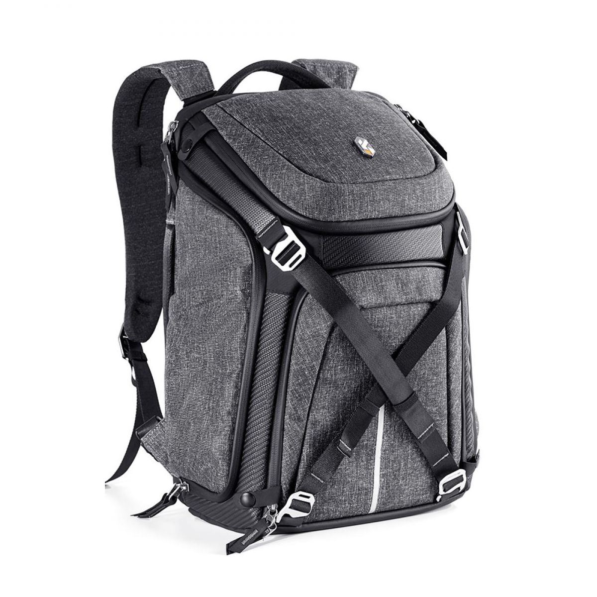 The gray K&F Concept Alpha Backpack holds two cameras, four Lenses, a 15.6" laptop, a 10.5" tablet, a tripod, and other essentials. The suspended top compartment accommodates travel necessities including clothes, a towel, and other personal items. The Alpha Backpack is designed for professional photographers and enthusiasts alike, with a high degree of freedom and detail to meet different loading and protection needs. It can be used to take professional video equipment with a full range of focal lengths on a road trip. Whether it's a professional shoot or a commuter holiday, the Alpha backpack is well suited for a diverse range of uses and changing environments.