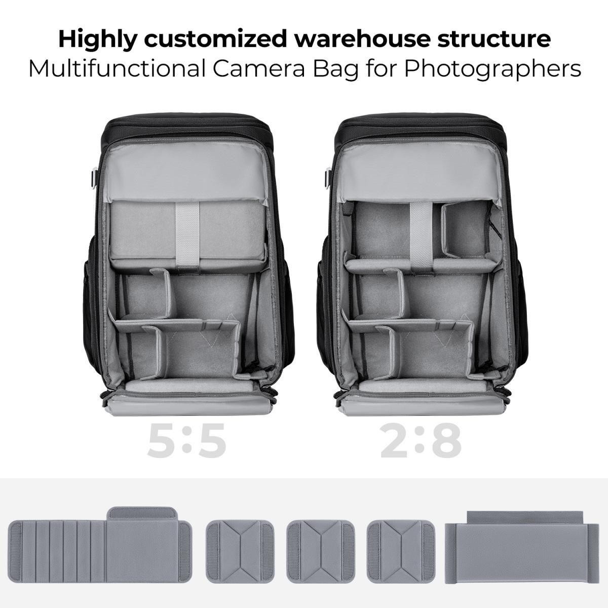 Αυτό το φωτογραφικό σακίδιο μπορεί να αποκτήσει χώρο 5:5 και 2:8 πιέζοντας προς τα πάνω ή προς τα κάτω για διαφορετικές ανάγκες.