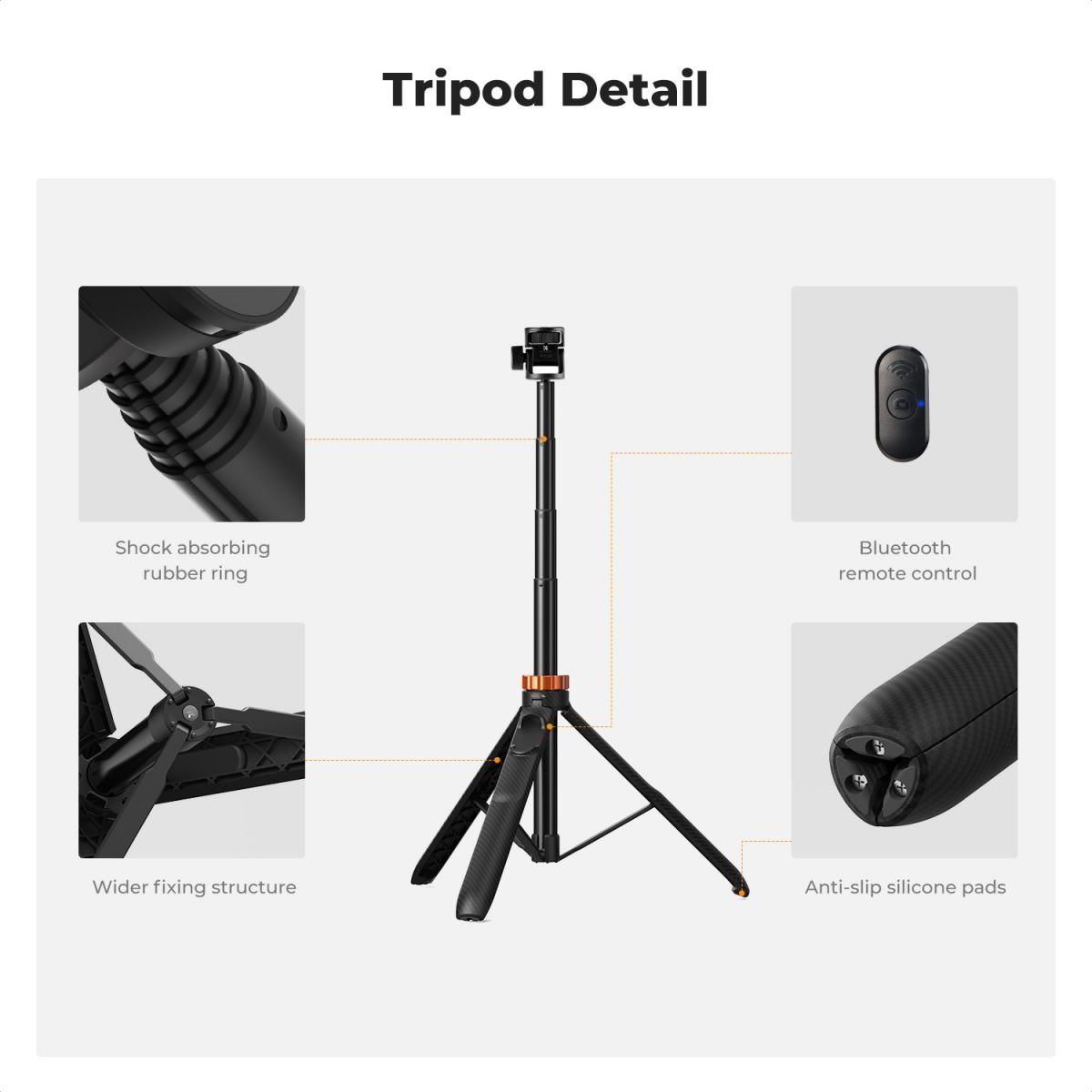 Σχεδιασμένο για τους λάτρεις της φωτογραφίας, αυτό το τρίποδο είναι συμβατό με κάμερες, φώτα, τηλέφωνα και άλλα φωτογραφικά προϊόντα. Εστιάζοντας στη συμβατότητα με τρίποδα, το σύστημα κλειδώματος έχει ενισχυθεί, η λαβή έχει παχύνει και τα λαστιχένια πόδια έχουν διευρυνθεί για βελτίωση της σταθερότητας και της άνεσης.