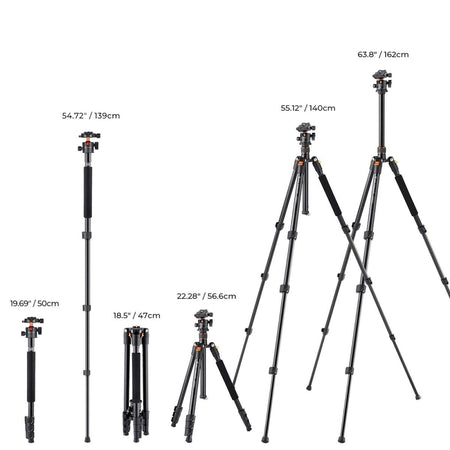 Practical and Portable: The tripod combines practical and portability factors, with the maximum height (without center column) of the most stability being 55.1'' (1400mm), providing sufficient stability and shooting height as far as possible; The max height is 63.8'' (1620mm), making standing shooting easier and the min-height is 22.4'' (570mm) to meet various shooting environment and photographic needs.