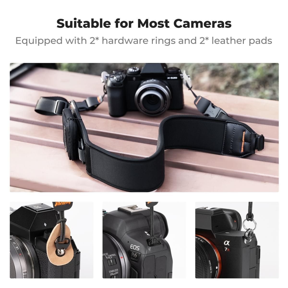 Ο ιμάντας λαιμού για τις περισσότερες φωτογραφικές μηχανές DSLR με 2 κρίκους ιμάντα.Περιλαμβάνει 1 ζευγάρι δερμάτινα αυτοκόλλητα κατά των γρατσουνιών και κρίκους υλικού (κατάλληλα για περισσότερες κάμερες).