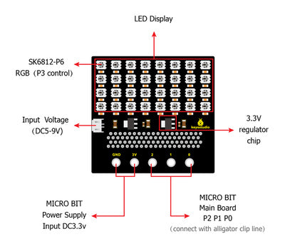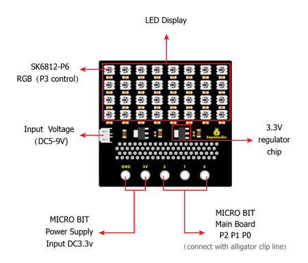 SK6812 4x8 LED dot matrix shield για Micro:bit από την Keyestudio. Διαθέτει 32 φώτα LED SK6812, πλήρως συμβατά με την πλακέτα ελέγχου Micro:bit και 2x 3.3V regulator chips.