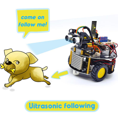 Multi-purpose function: Obstacle avoidance, follow, IR remote control, Bluetooth control, ultrasonic follow and displayed face emoticons