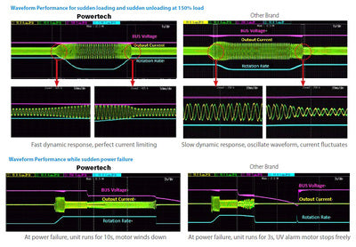 Deceleration to stop: In case of power loss, the energy from load feedback is used to compensate and decelerate the motor until standstill, to prevent mechanical damage.