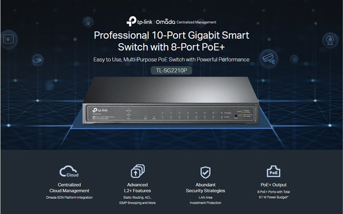 Το TL-SG2210P είναι ένα switch επαγγελματικών προδιαγραφών που εξοπλίζεται με 8 θύρες δικτύου PoE+ και 2 θύρες SFP με ταχύτητες 10/100/1000Mbps.
