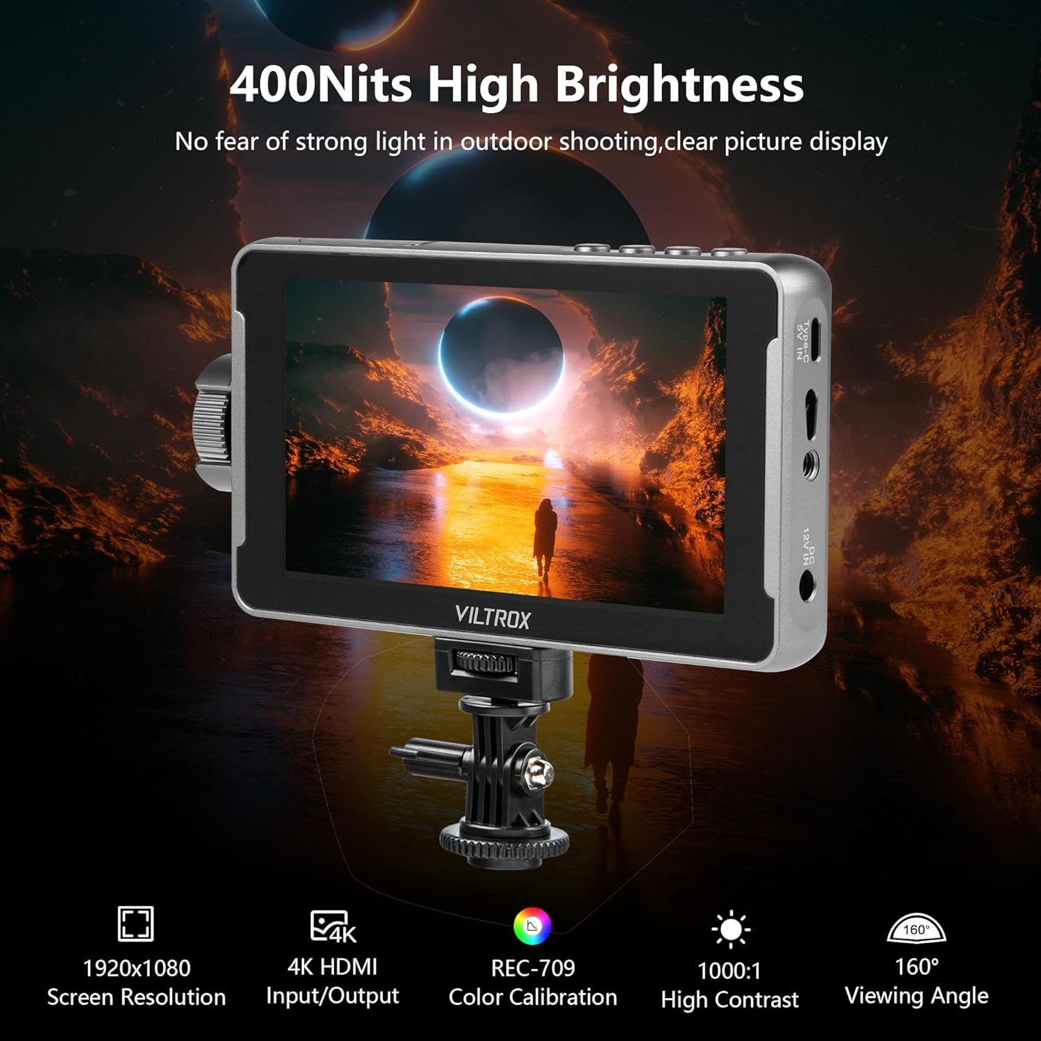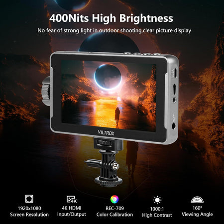 VILTROX DC-550 Lite camera field monitor provides a sharp image, with 400nits high-brightness display screen, 4K full HD 1920 x 1080 resolution at 30Hz, a 5.5inch IPS panel with 160° viewing angles, 1000:1 contrast ratio, REC-709 color calibration, making you enjoy sharper and richer colors image.