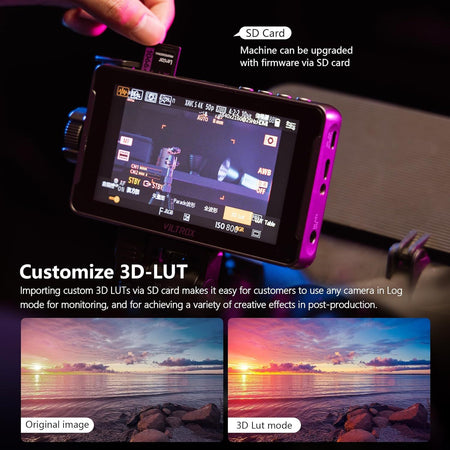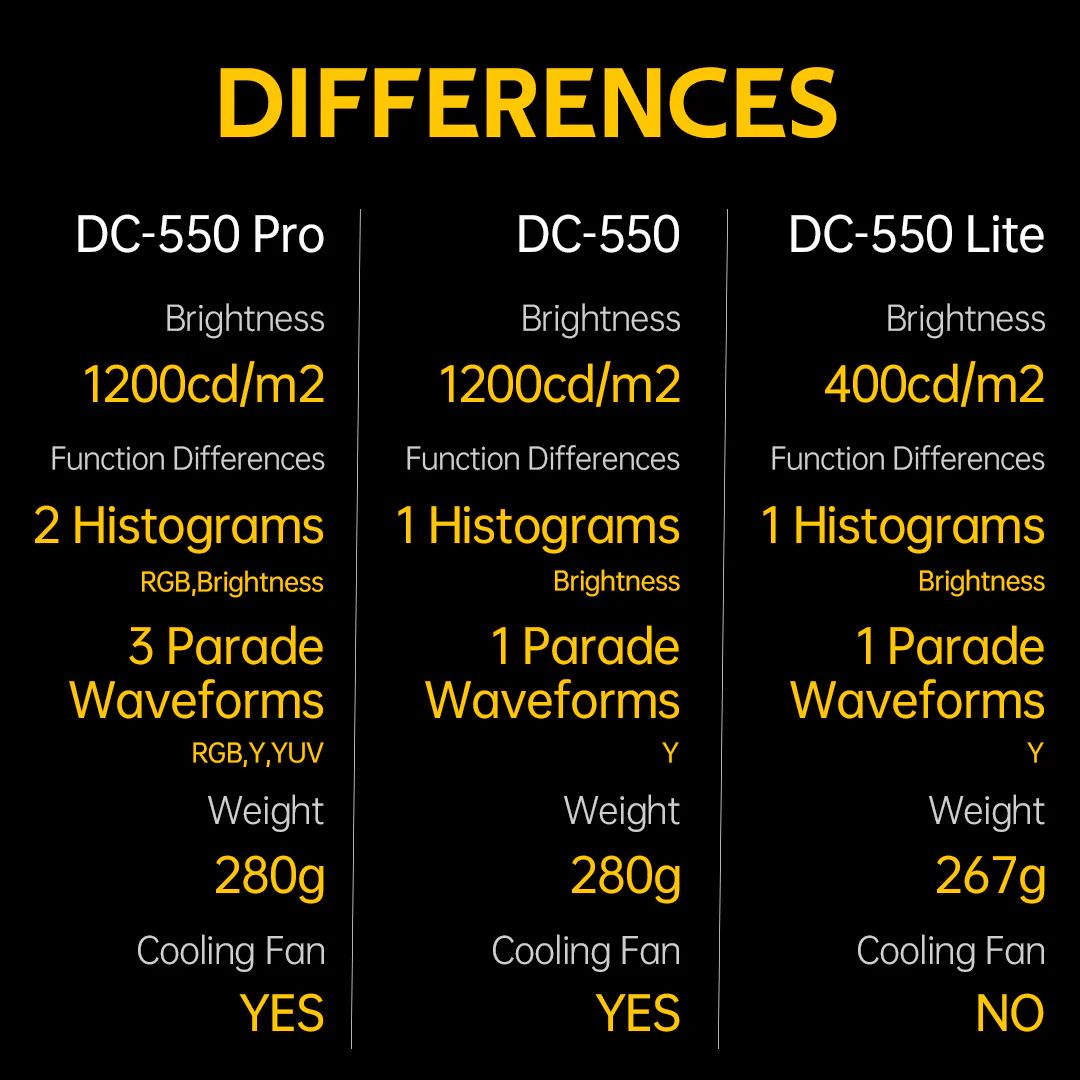 Custom 3D LUT: DC-550 Lite camera monitor has lots of professional monitoring functions, such as Parade waveform, vector graph, brightness histogram, auxiliary focus, audio column, image flip, false color, etc. By importing 3D LUT through the SD card, the photographer can achieve a variety of creative effects in the post-editing and use any camera Log mode to shoot and monitor.