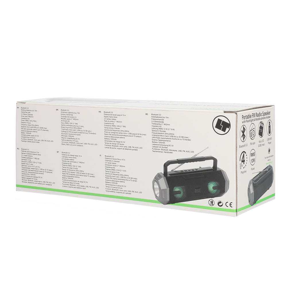 • Λειτουργίες: Bluetooth, micro card, USB, FM, AUX, LED φακός