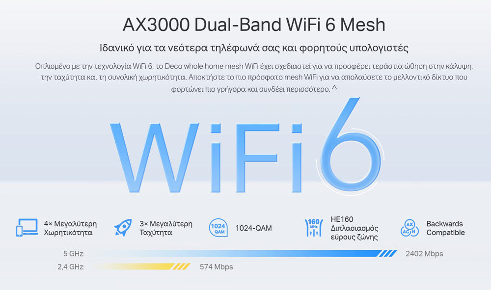 -AX3000 Dual-Band Wi-Fi 6- Απολαύστε την παρακολούθηση της αγαπημένης σας σειράς σε 4K με συνδυαστικές ταχύτητες έως και 3000 Mbps (574 Mbps στα 2,4 GHz και 2402 Mbps στα 5 GHz)