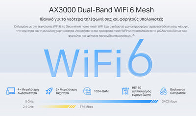 Οπλισμένο με την τεχνολογία WiFi 6, το Deco whole home mesh WiFi έχει σχεδιαστεί για να προσφέρει τεράστια ώθηση στην κάλυψη, την ταχύτητα και τη συνολική χωρητικότητα. Αποκτήστε το πιο πρόσφατο mesh WiFi για να απολαύσετε το μελλοντικό δίκτυο που φορτώνει πιο γρήγορα και συνδέει περισσότερο.