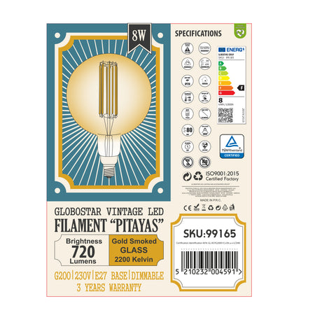 GLOBOSTAR® PITAYAS 99165 Λάμπα E27 G200 LED 8W 720lm 360° AC 220-240V IP20 Ultra Θερμό Λευκό 2200K Dimmable - Long Filament Chip - Μελί - Μ20 x Π20 x Υ30cm - 3 Χρόνια Εγγύηση