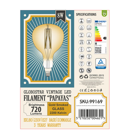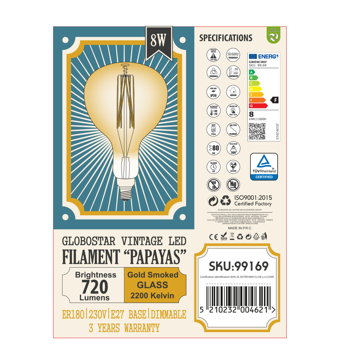 GLOBOSTAR® PAPAYAS 99169 Λάμπα E27 ER180 LED 8W 720lm 360° AC 220-240V IP20 Ultra Θερμό Λευκό 2200K Dimmable - Long Filament Chip - Μελί - Μ18 x Π18 x Υ30cm - 3 Χρόνια Εγγύηση