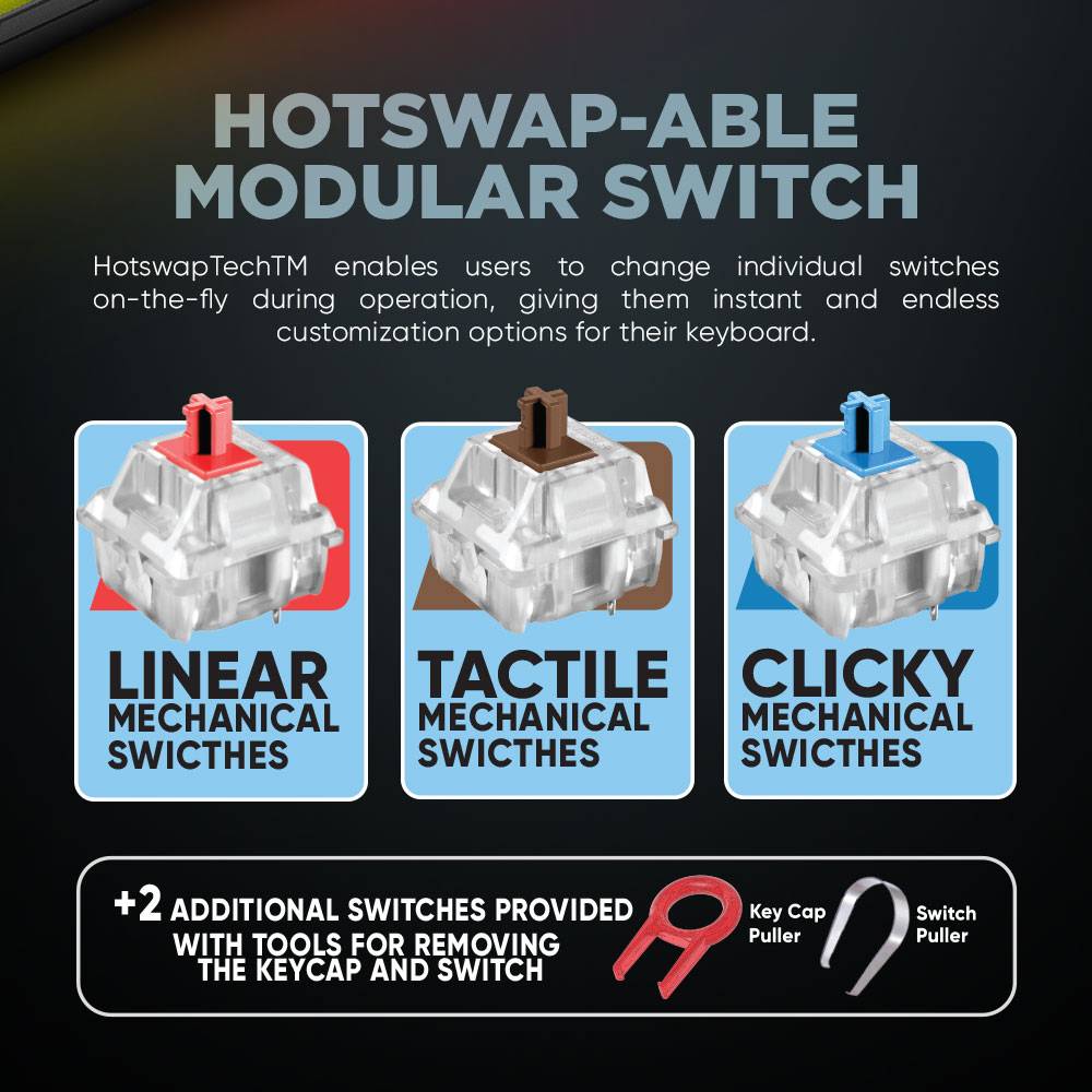 • Ανταλλάξιμοι Διακόπτες (Hotswappable): Αλλάξτε τους διακόπτες σας εύκολα και γρήγορα, για μια εντελώς προσαρμοσμένη εμπειρία πληκτρολόγησης και άνεσης.