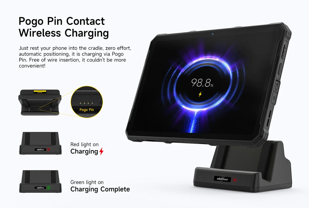 Επιτραπέζια βάση φόρτισης από την Ulefone, συμβατή με τα tablet της σειράς Armor Pad 4. Φορτίζει την συσκευή σας μέσω των επαφών Pogo Pin με μέγιστη απόδοση 10W. Επιπλέον, στο πίσω μέρος της διαθέτει έξοδο USB που σας επιτρέπει να φορτίζετε παράλληλα ακόμη μια συσκευή η όποια φορτίζει μέσω θύρας USB.
