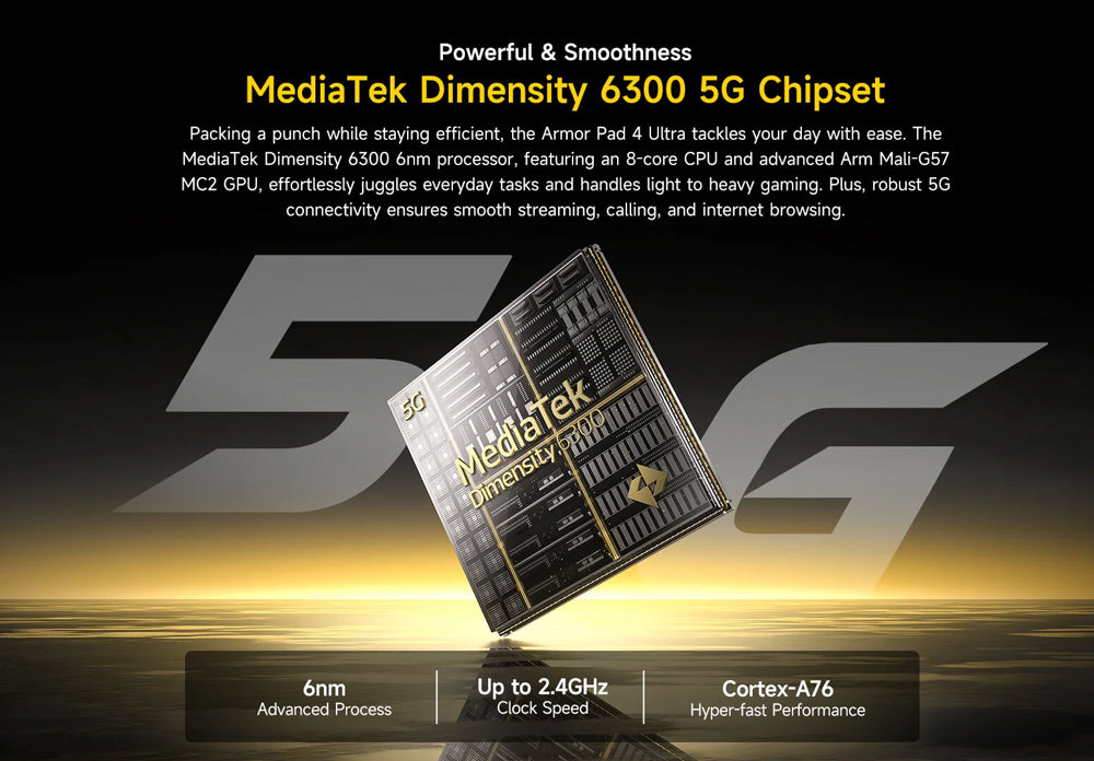 Εξοπλισμένο με επεξεργαστή 8 πυρήνων και λειτουργικό Android 14, το Armor Pad 4 Ultra προσφέρει υψηλή απόδοση για απρόσκοπτη περιήγηση στο διαδίκτυο, παιχνίδια, πολυμέσα και πολλά άλλα.