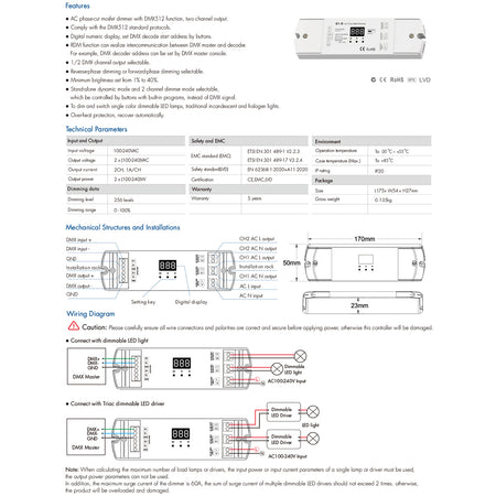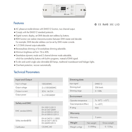 GLOBOSTAR® SKYDANCE-S1-D 70671 AC Trailing Edge DMX Dimmer με 2 x 1A 240W Κανάλια AC 220-240V 2A 480W Max IP20 - DMX512 & RDM - Μ16.7 x Π5 x Υ2.4cm - 5 Χρόνια Εγγύηση