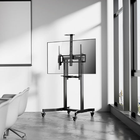 Διαθέτει ανθεκτικούς τροχούς με μηχανισμό κλειδώματος για εύκολη και ασφαλή μεταφορά και τοποθέτηση της τηλεόρασης. Υποστηρίζει τις περισσότερες τηλεοράσεις LCD από 55” έως 100” και είναι συμβατό με VESA, καλύπτοντας μεγάλη γκάμα προτύπων στήριξης. Το σύστημα διαχείρισης καλωδίων διασφαλίζει την τακτοποίηση και κομψότητα του χώρου σας.