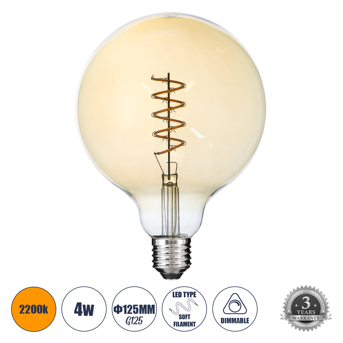 GLOBOSTAR® BUBBLE 99138 Λάμπα E27 G125 LED 4W 280lm 360° AC 220-240V IP20 Ultra Θερμό Λευκό 2200K Dimmable - Soft S Spiral Filament Chip - Μελί - Μ12.5 x Π12.5 x Υ18cm - 3 Χρόνια Εγγύηση