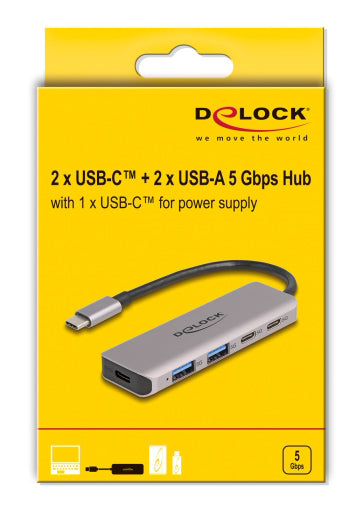 Αυτό το hub της Delock μπορεί να συνδεθεί με το laptop ή το desktop σας μέσω θύρας USB-C και να επεκτείνει τις θύρες του με 2x USB και 2x USB-C θύρες. Διαφορετικές συσκευές USB, όπως docking stations, card readers, εξωτερικοί HDD/SSD κ.λπ. μπορούν να συνδεθούν μέσω του hub.
