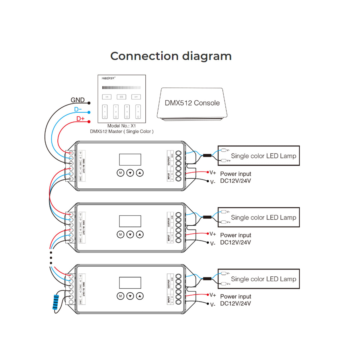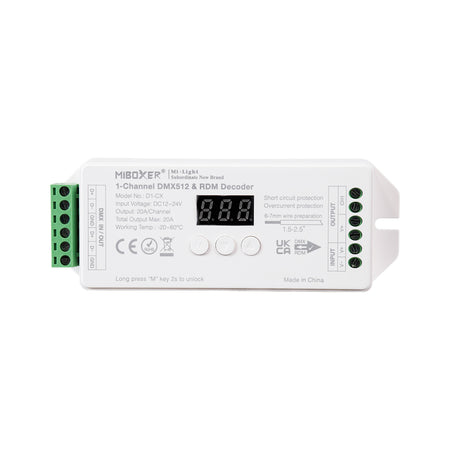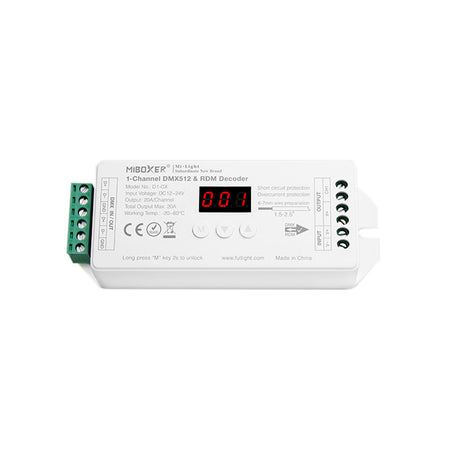 GLOBOSTAR® MiBOXER-D1-CX 71424 DC DMX Master Dimmer / Controller / Decoder Υψηλής Ταχύτητας με 1 x 20A 480W Κανάλι DC 12-24V 20A 480W Max IP20 - DMX512 & RDM - Μ13 x Π5 x Υ2.5cm - 5 Χρόνια Εγγύηση