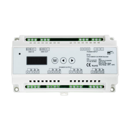 GloboStar® 71449 D12 SKYDANCE DC DMX & RDM Dimmer Din Rail Ράγας High Speed Controller / Decoder / Master 12 Καναλιών DC 12-24V 12 x 5A 120W - Max 60.5A 1440W - IP20 Μ15.5 x Π9 x Υ6cm - 5 Years Warranty