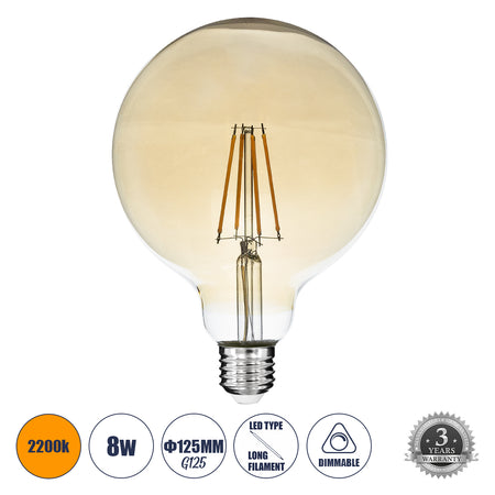 GLOBOSTAR® BUBBLE 99043 Λάμπα E27 G125 LED 8W 720lm 360° AC 220-240V IP20 Ultra Θερμό Λευκό 2200K Dimmable - Long Filament Chip - Μελί - Μ12.5 x Π12.5 x Υ18cm - 3 Χρόνια Εγγύηση