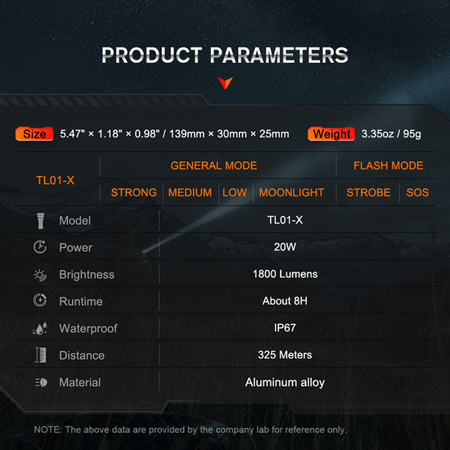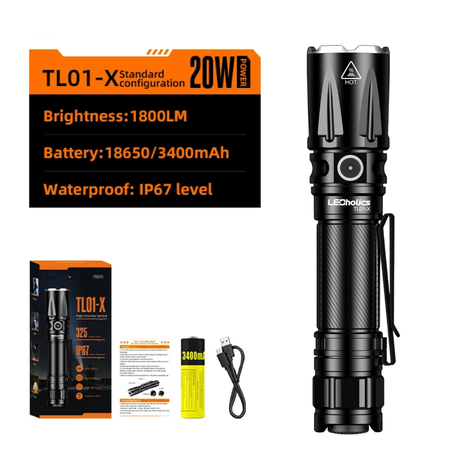 Ανακάλυψε τον ισχυρό LED φακό χειρός TL01-X 1863 Lumens φωτεινότητα στα 20W. Με Tactical κομβίο On/Off & δέσμη έως & τα 325 μέτρα. Με 5 λειτουργίες φωτισμού Strong, Medium, Low, Moonlight, Strobe, SOS.