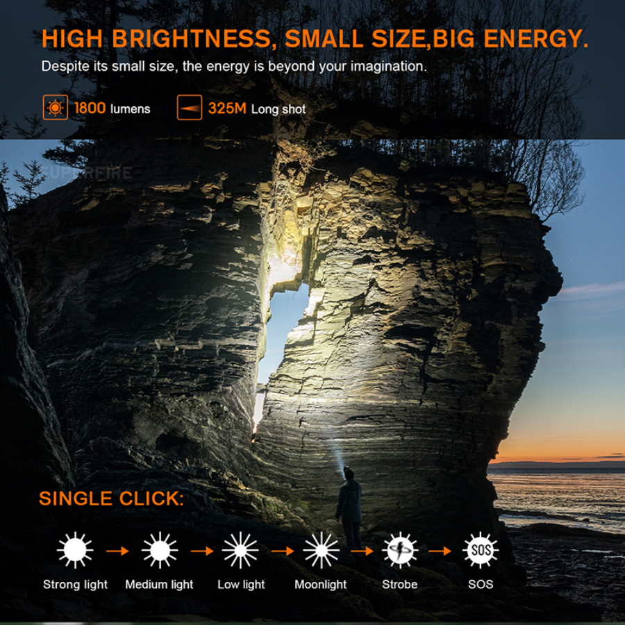 Εξοπλισμένος με 18650 μπαταρία 3400mAh παρέχοντας έως & 8 ώρες αδιάκοπης λειτουργίας στο δυνατό φωτισμό(Strong Mode).