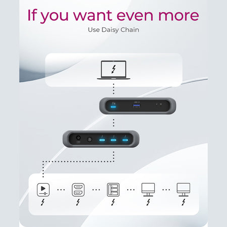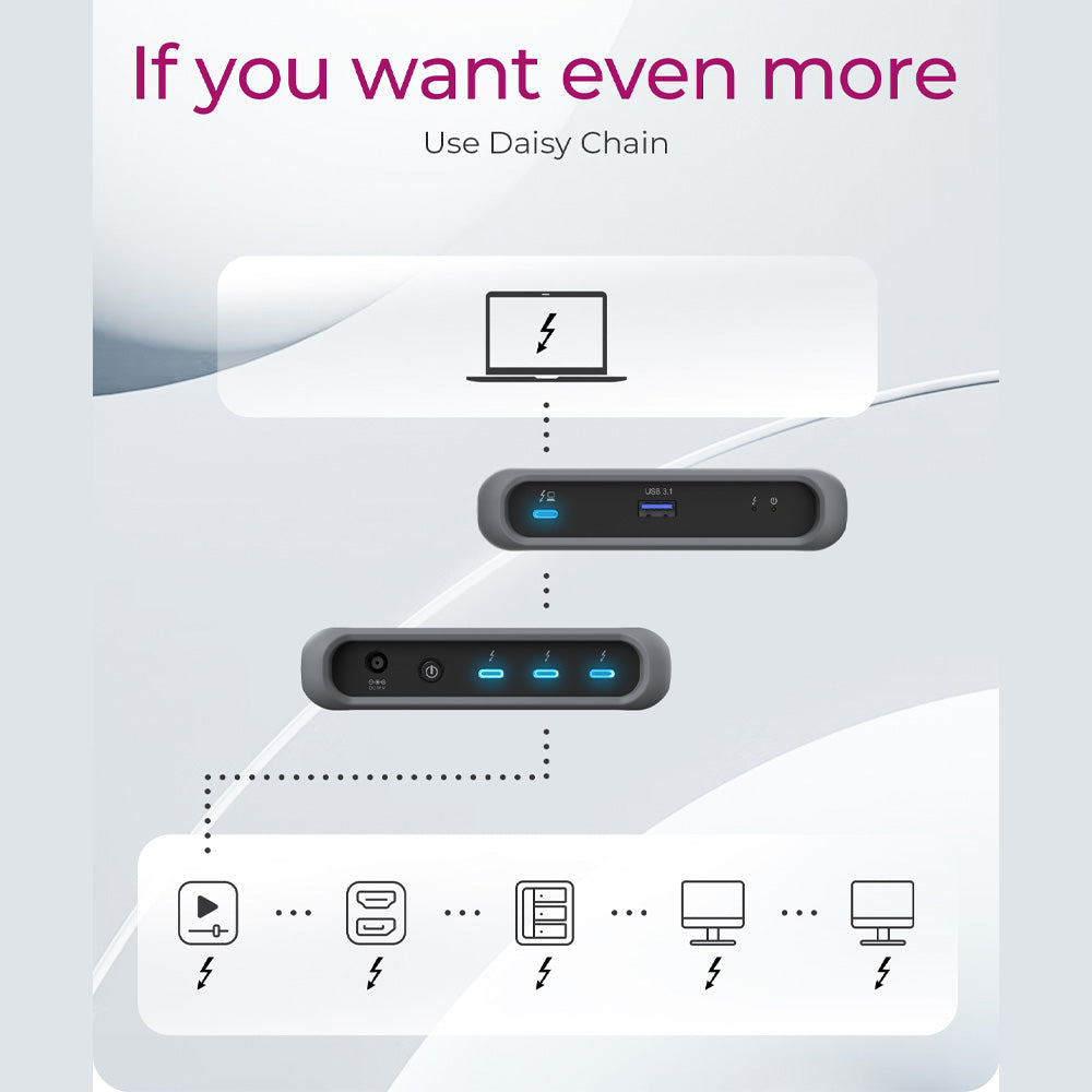 • Αλυσίδα Daisy-Chaining: Μπορείτε να συνδέσετε έως 6 Thunderbolt™ συσκευές σε αλυσίδα, επεκτείνοντας τις δυνατότητες συνδεσιμότητας. Αυτή η λειτουργία επιτρέπει τη σύνδεση πολλών περιφερειακών ή σταθμών σύνδεσης.