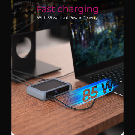 • Τροφοδοσία Ρεύματος (PD): Παρέχει 85W τροφοδοσία ρεύματος για φόρτιση συσκευών όπως smartphones, laptops και άλλες συσκευές που υποστηρίζουν USB PD, εξαλείφοντας την ανάγκη για εξωτερικό τροφοδοτικό.