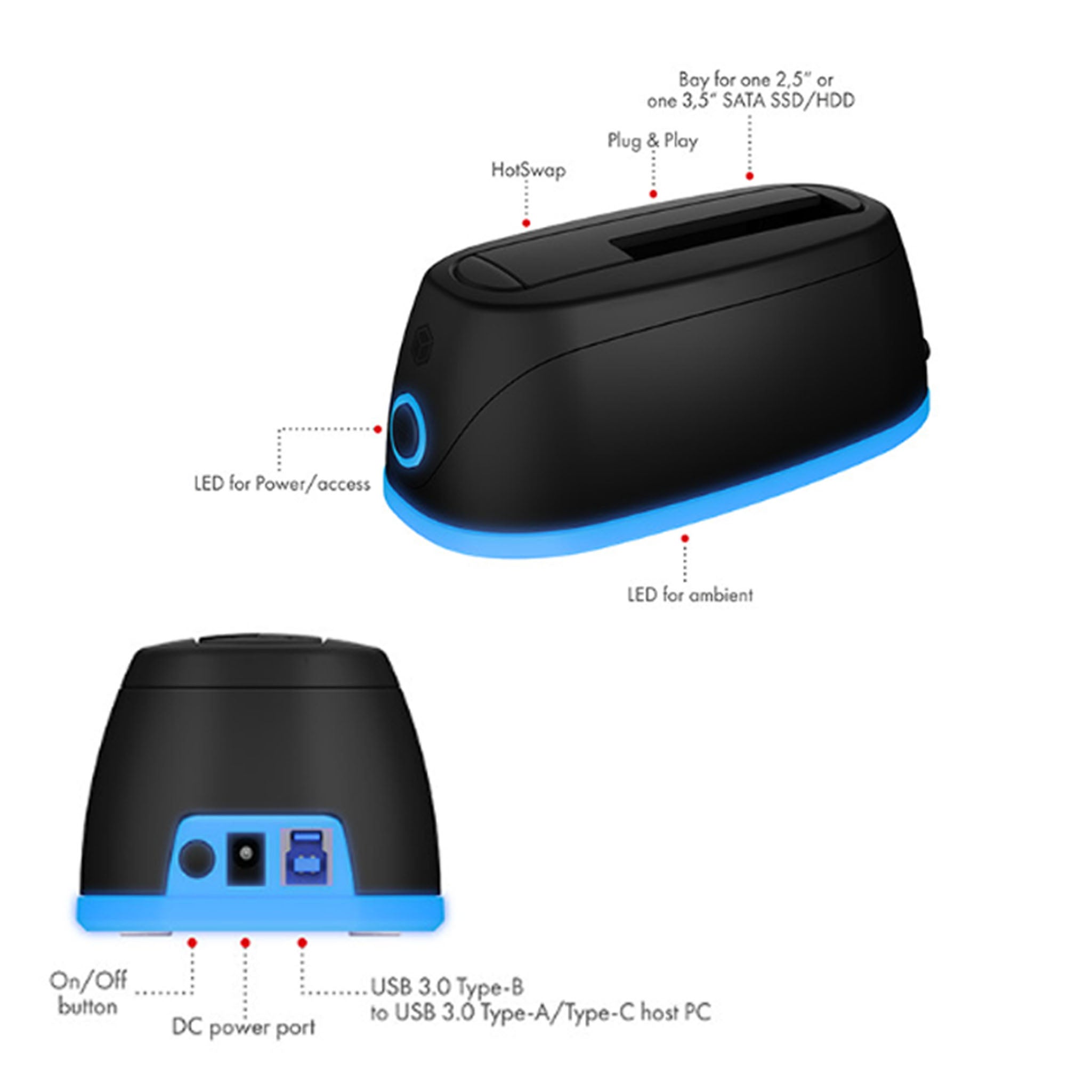 Ο DockingStation είναι η ιδανική λύση για τη σύνδεση ενός HDD/SSD στον υπολογιστή σας. Διαθέτει LED φωτισμό που περιβάλλει το περίβλημα με μπλε λωρίδα, προσφέροντας όχι μόνο αισθητική αξία, αλλά και ένδειξη της λειτουργίας και της πρόσβασης στον σκληρό δίσκο. Αυτός ο docking station προσφέρει εύκολη εγκατάσταση μέσω Plug & Play, HotSwap τεχνολογία για αντικατάσταση δίσκων χωρίς να κλείσετε τη συσκευή, και υποστηρίζει USB Type-A και Type-C® συνδέσεις για μέγιστη συμβατότητα.
